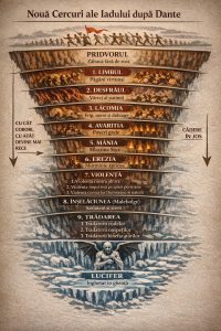 Dacă privim mai larg, structura iadului este o hartă psihologică a degradării personalității: mai întâi pierderea măsurii → apoi dependența → apoi agresiunea → apoi distrugerea → și în final trădarea, unde dispare capacitatea de legătură cu o altă ființă umană.